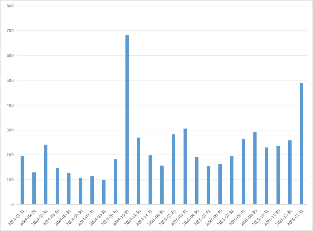 3、另外,股民的热情其实很高,我们来看一个数据,上交所数据显示,2026年1月,A股新开户数为498.15万,比2025年1月暴增213%。下面这张图更加直观,和过往数据对比来看,除了2024年的10月,相对于其月份都是翻倍增长。可以说,散户正在跑步进场。