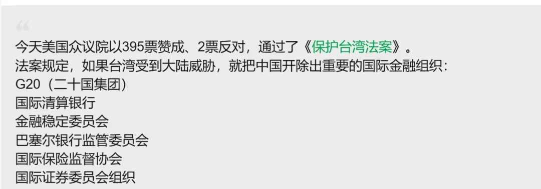 二是美国高票通过《保护台湾法案》。