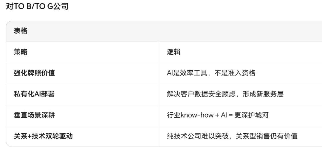因为AI普及的结果是——普通应用开发门槛降低,中小型公司易被AI替代;但To G/To B企业因数据安全和切换成本高,反而更具竞争力,牌照成为关键壁垒。