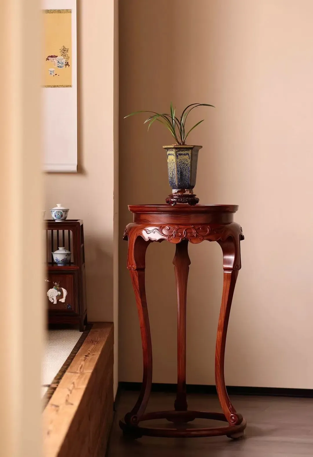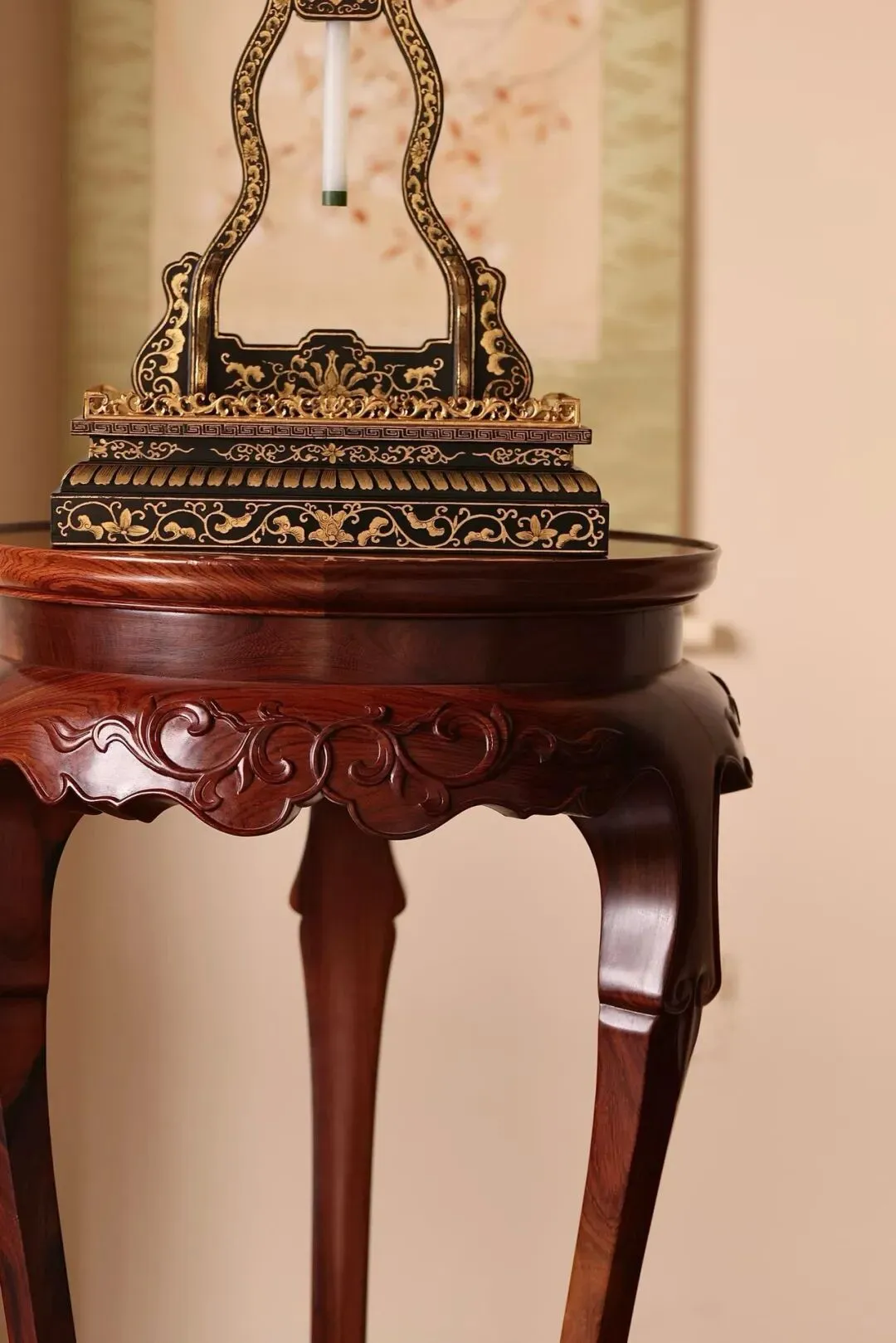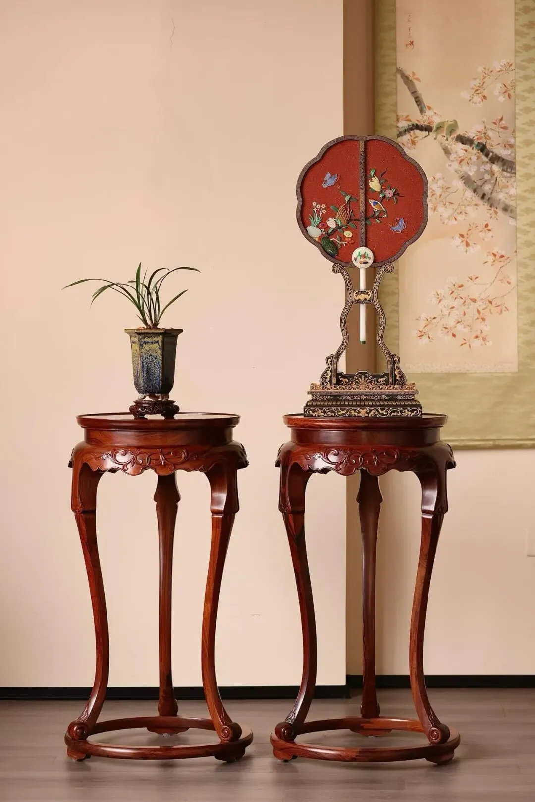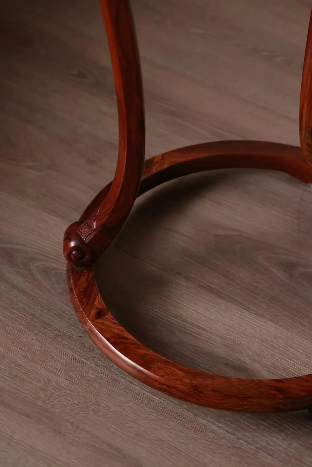 最像黄花梨的一种高端木材,却因为市场上行情不好,这种材质反而更受欢迎。它就是白酸枝材质,学名奥氏黄檀,属于国标红木的红酸枝木类,具有酸香味。白酸枝的纹理非常像黄花梨的材质,这也是在这种材质上不断加分的亮点,同时这种材质本身的油性密度都还是不错的,所以也受到很多有钱人的青睐和喜欢。而这几年大家说行情不好,消费降级,大家不怎么消费大红酸枝材质的前提下,把眼光放到了白酸枝材质身上,深受市场欢迎。一对白酸枝精品制作的三足香几,老厂精工制作,器型经典,做工精美,做得相当漂亮。这种三足香几,非常耗料,三条腿足三弯,视觉美感非常足,圆形的家具,通常都非常耗料
