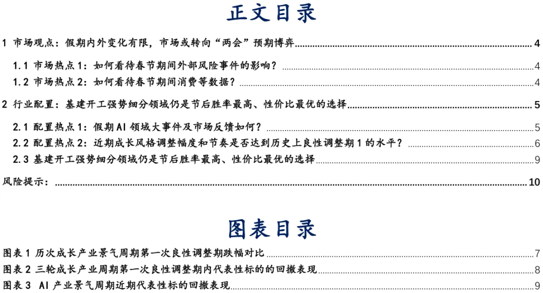 节后A股有望开门红,但能否形成新一轮上涨仍不明确。美伊冲突与美国关税政策变化对市场形成一定扰动,春节期间高频数据整体平稳,节后市场可能转向“两会”预期博弈。配置上,第一次良性调整期仍未结束,短期继续强调减少弹性方向配置,重视稳定和确定性,其中规律性开工机会正当时,关注高性价比10大细分领域和18只优势个股组合。有中长期涨价趋势预期,且前期未超涨的存储、化工、机械设备亦可配置。