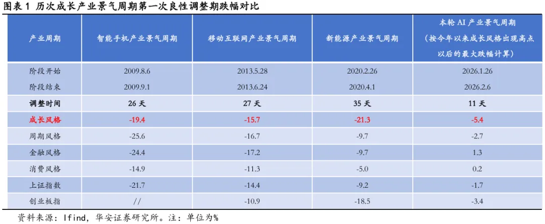 假设本轮AI产业景气周期的第一次良性调整期开始日期为2026年1月26日,即便按照出现最大跌幅的时间段来对比,主要指数以及各风格的跌幅也远不及历史可比情形。