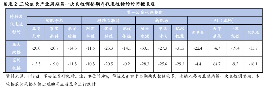 第一次良性调整期内,代表性个股的最大跌幅在15%-30%左右。我们在2025Q4季度策略中复盘过历次成长产业周期代表性标的的上涨时间和空间,在回撤复盘中,仍以相同的标的作为观察对象。最大跌幅来看,智能手机景气产业周期第一次良性调整期内,三只代表性标的最大回撤在15%-20%左右。移动互联网产业时期则在15%25%左右。新能源产业时期则在30%左右。若同样假设按照本轮AI产业景气周期的第一次良性调整期开始日期为2026年1月26日,截至2月13日,新易盛、天孚通信、中际旭创、寒武纪等代表性标的的最大跌幅为15%-20%左右,区间跌幅上看,中际旭创、寒武纪在1月26日至2月13日期间内跌幅分别达到9.2%、16.1%,也较为接近历史可比情形,新易盛、天孚通信的区间回撤则相对较低。