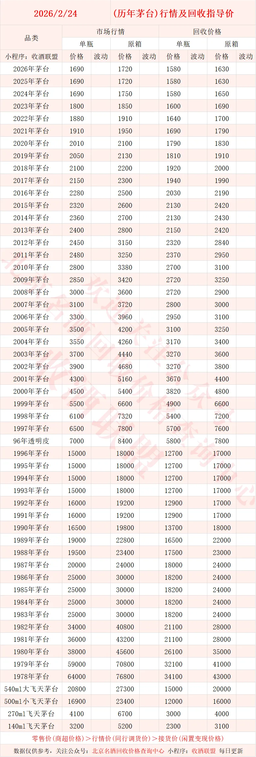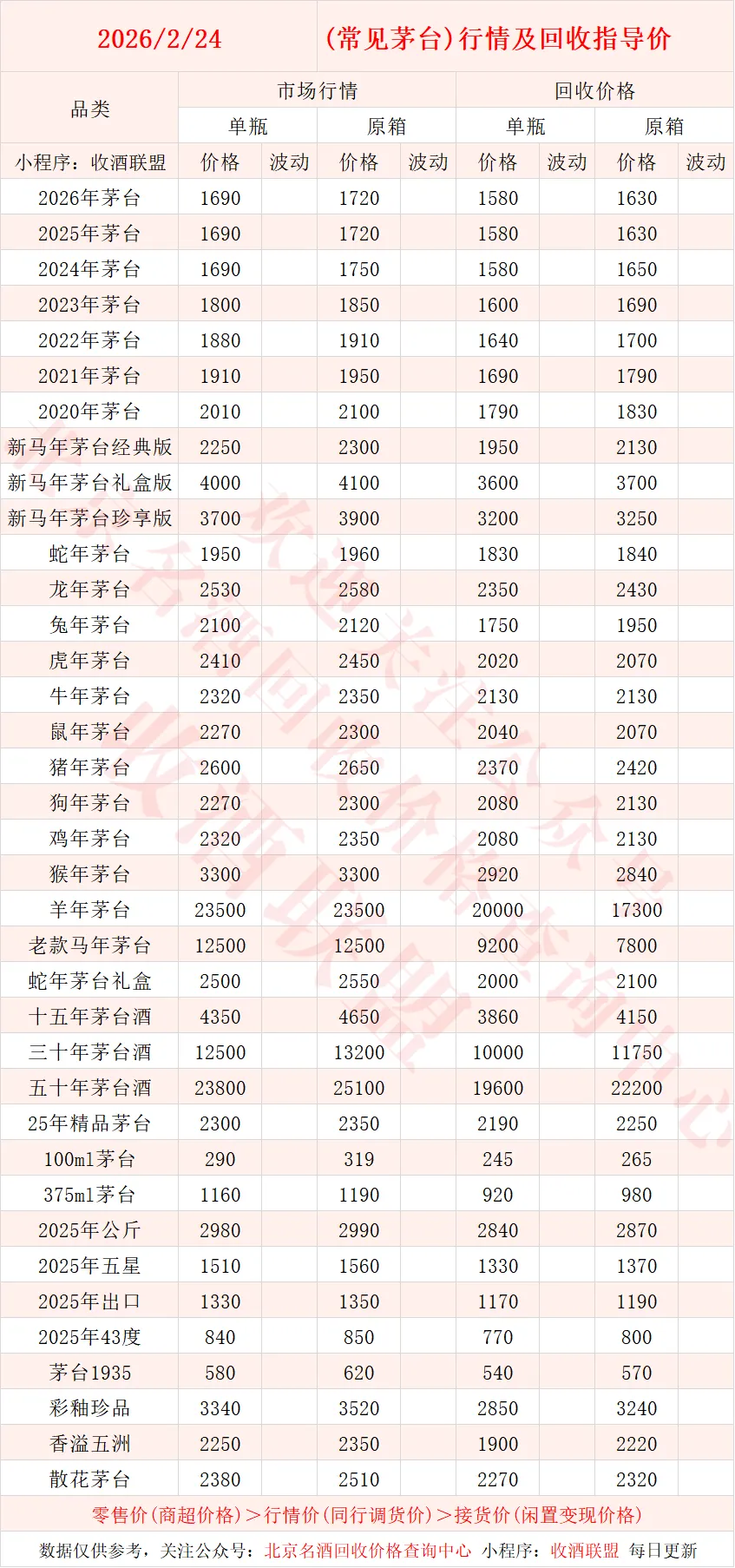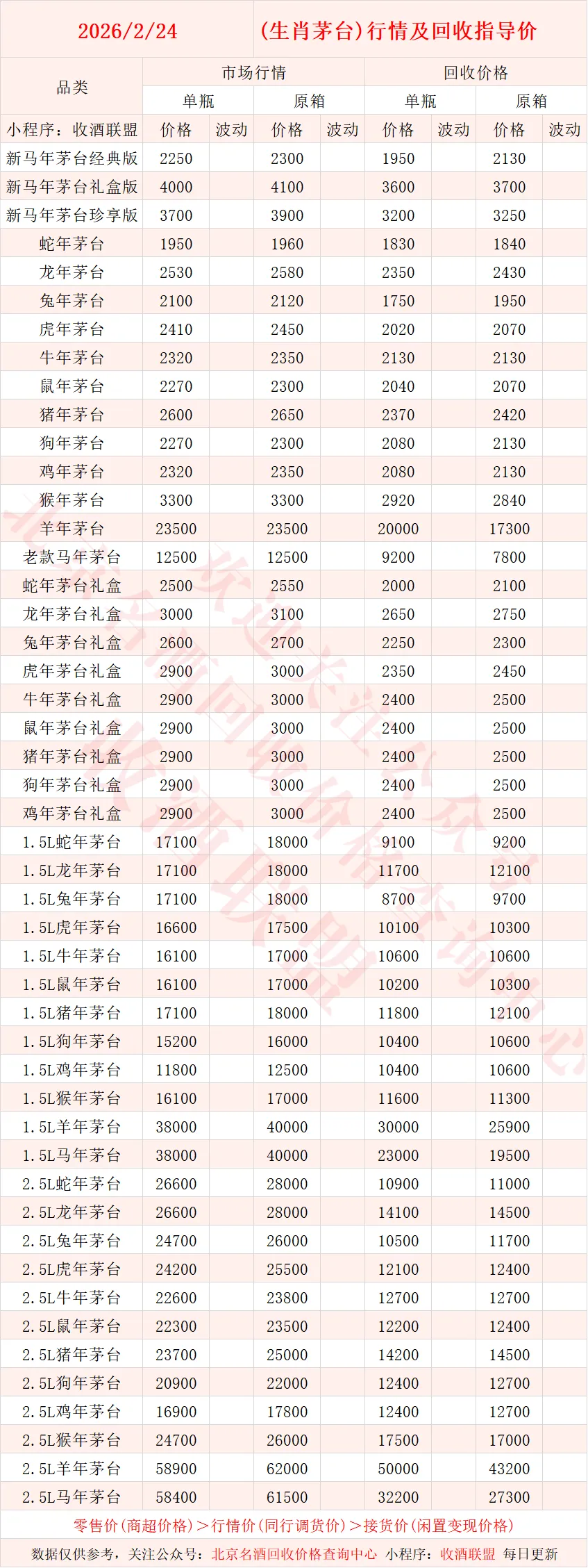 以下内容为,本公众号每日会及时更新的飞天茅台、生肖茅台、年份茅台,陈年茅台及不同毫升容量茅台的市场行情和回收报价;还包含五粮液、汾酒、剑南春、泸州老窖等国产名酒的行情及回收价,法国拉菲、木桐、玛歌等名庄红酒的回收报价,轩尼诗、马爹利、人头马等世界知名洋酒威士忌的回收参考价,每日整理不易,请点击关注支持。▪畅销类茅台行情及接货参考价▪