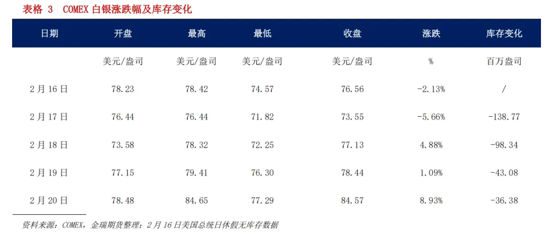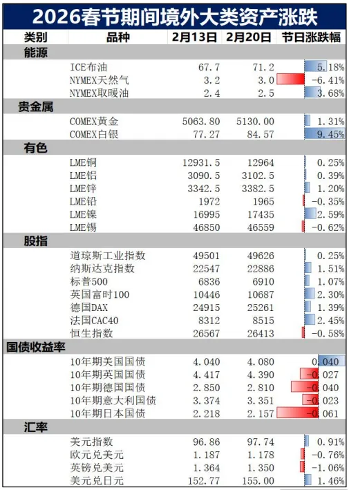 市场风险偏好修复欧美权益类资产普遍上行,贵金属价格大幅反弹有色金属多数温和上涨。受美国最高法院推翻部分加征关税政策及强劲的企业盈利表现提振,春节期间市场风险偏好显著回升,带动欧美权益类资产普遍上涨。另一方面,美国近期核心通胀(PCE)数据凸显粘性,市场对美联储近期降息的预期降温,支撑美元指数表现强势,欧元、英镑及日元相应走弱;同时,日本国会大选落地且日本央行维持利率不变,市场对日债激进紧缩的担忧阶段性缓解,日本国债收益率出现较大幅度下行。商品方面,在地缘政治不确定性与避险资金的交织影响下,贵金属表现优异,其中白银大幅飙升逾9%;有色金属多数走强,其中镍价表现强势而锡价偏弱;能源方面走势显著分化,伊朗问题持续发酵叠加部分产区供应扰动支撑布伦特原油强劲上涨,而天然气则因暖冬预期及库存高企大幅回落。