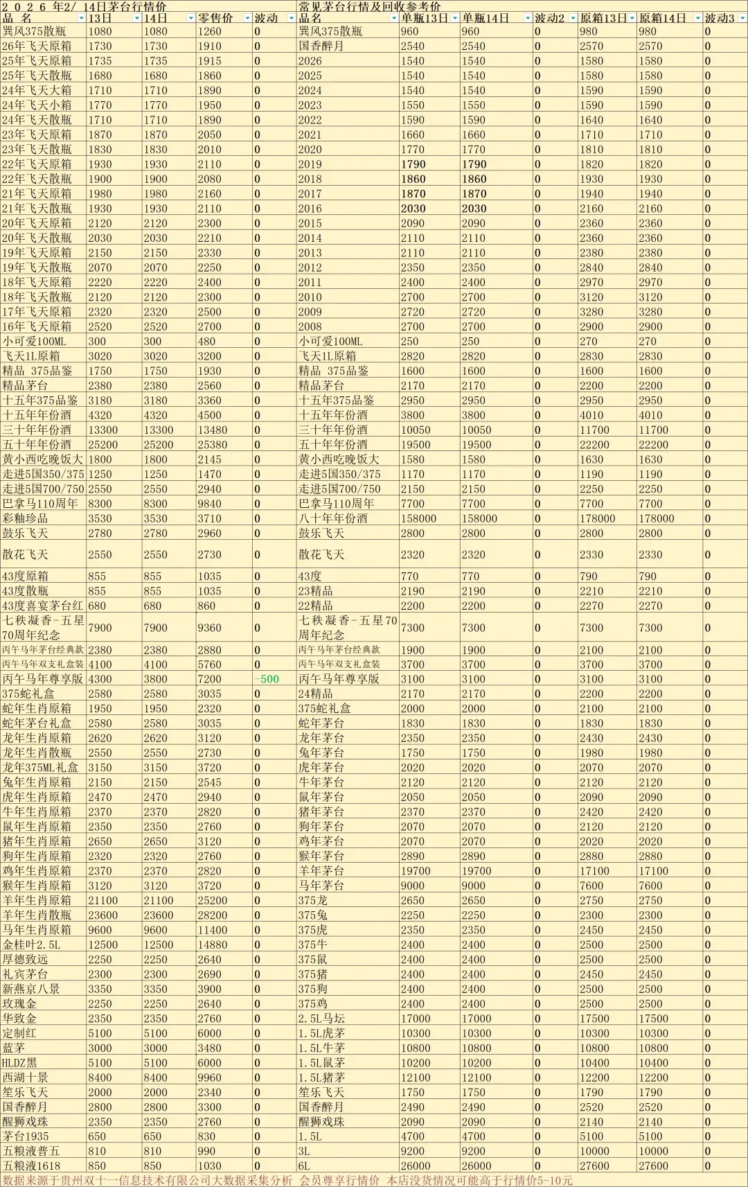今天是2026年2月14日星期六,与昨日行情相比:生肖茅台中:丙午马年珍享版下跌。