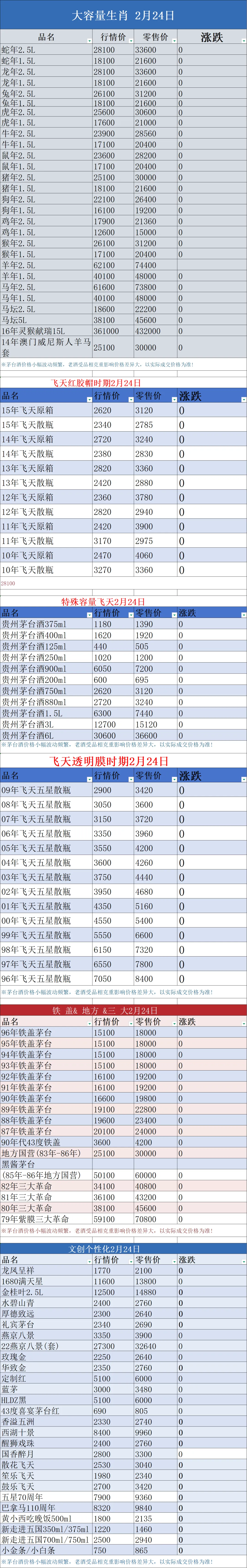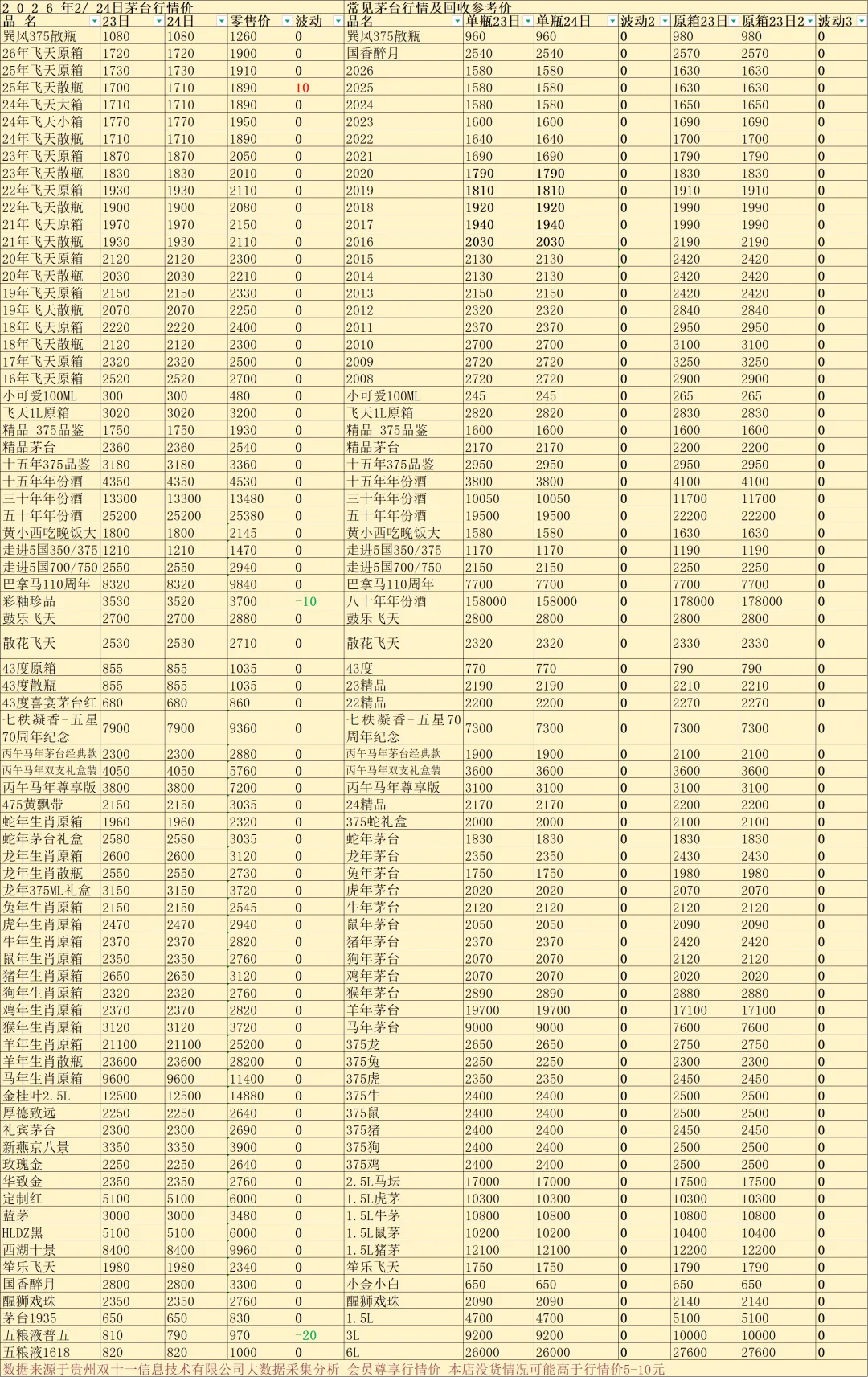 今天是2026年2月24日星期二,与昨日行情相比:常规茅台中:2025年散飞上涨;彩釉珍品下跌;五粮液普五下跌。