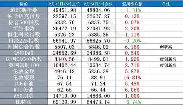 马年春节假期落幕,全球资本市场多数上行,为A股节后行情注入强心剂。假期期间,韩国、英国、法国等多国股指纷纷创下历史新高,国际大宗商品市场同样表现活跃,受美伊冲突升级影响,金银、油价大幅攀升,其中现货白银涨幅接近17%,全球风险偏好回升的基调已然确立,也为A股节后“红包行情”奠定了良好的外部基础。