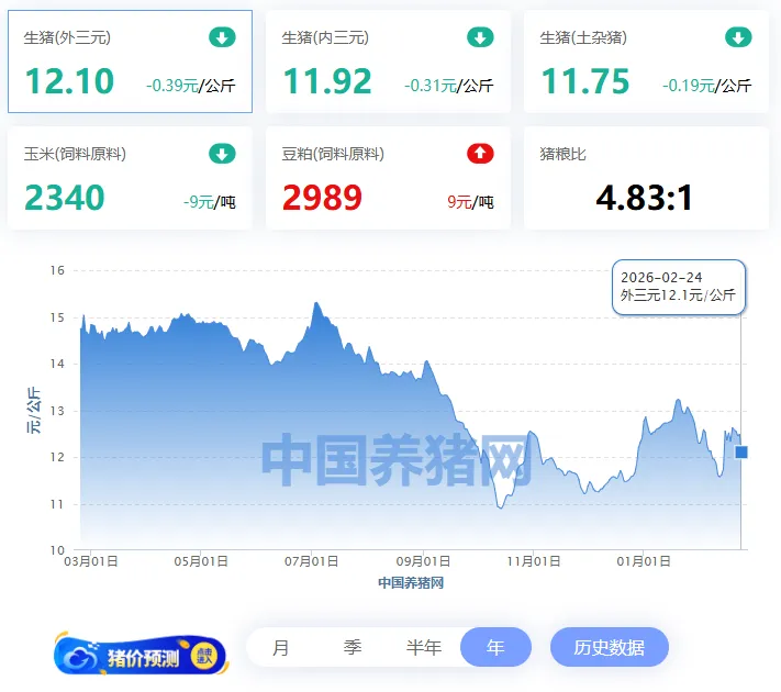 2026年2月24日全国外三元均价12.10元/公斤,今日猪价较昨日报价下跌了0.39元/公斤。