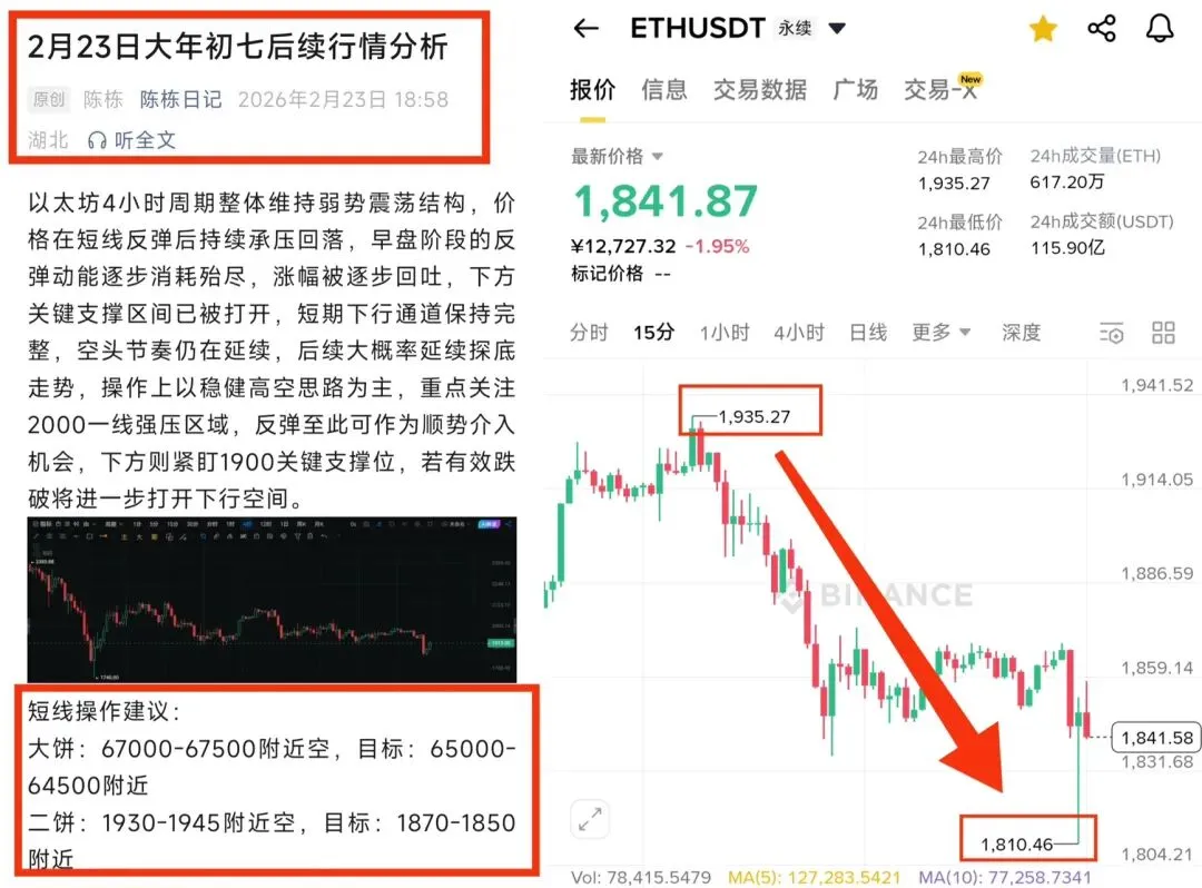 大家好我是你们的老朋友陈栋,假期返工第一天,我们先回顾一下今日的行情:昨夜至今晨市场走势与我们晚间预判高度契合,空头节奏完全兑现,凌晨时段比特币自65500关口回落,最低触及63900区域,短线回落幅度超1600点,以太坊同步由1900附近下探至1840一带,调整幅度约60点;