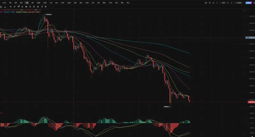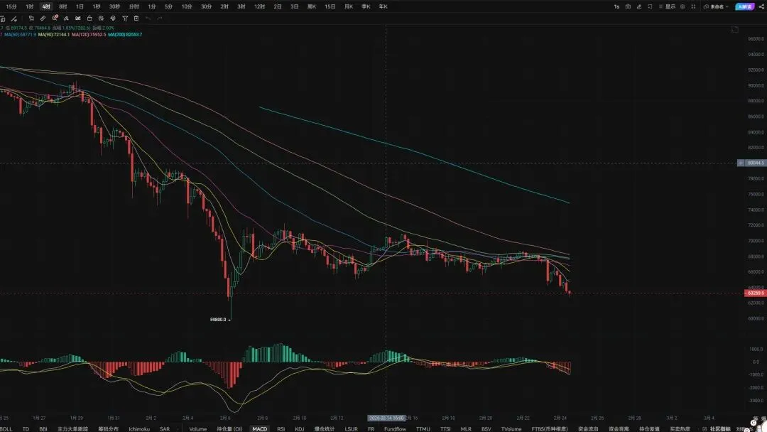 4小时周期盘面显示,本轮反弹动能明显不足,价格未能有效试探MA10日均线压力,布林带维持开口运行态势,短期均线组同步拐头向下发散,MACD快慢线持续向下延伸,空头量能柱保持放量格局,KDJ指标再度下行逼近0值区域,需警惕该位置关键支撑有效性,VR指标在100数值附近震荡整理,整体结构仍处于偏弱格局,反弹力度受限,短期支撑位成为行情分水岭,一旦有效下破或将刷新阶段性低点,操作上短线可依托关键支撑布局,下方首要关注62000区域支撑,其次留意前期低点附近的阶段性底部支撑。