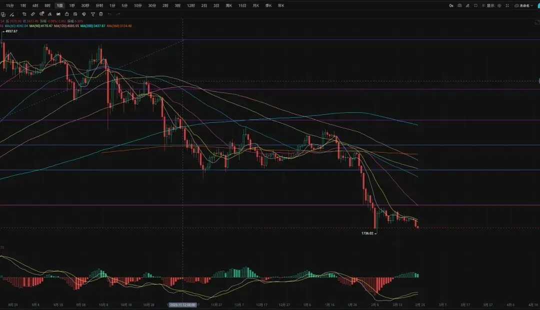 从以太坊日线结构观察,昨日K线收出小阴线,价格全程承压于MA5与MA10日均线双重阻力,反弹动能始终未能有效释放,下方重点依托前期震荡低点1730一线作为关键支撑区域,若日内价格再度试探下行,需重点观察该位置能否形成有效止跌企稳信号,该位置同样是日线级别重要的结构颈线支撑,只要此关键支撑不被有效跌破,行情在反复探底夯实底部后,具备进一步反弹拉升的技术条件,当前价格在快速下探后出现阶段性反抽修复,需重点确认是否形成二次探底结构,若成功完成双底形态构筑,后续反弹空间将被有效打开。