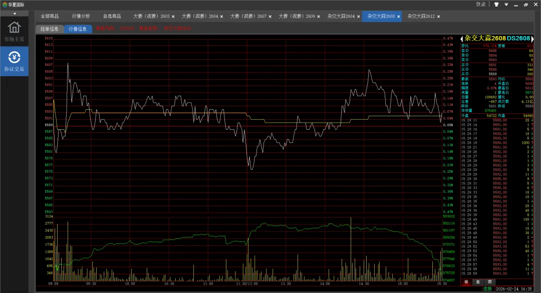 下午开盘,空方主动增仓,盘面短暂延续中午收盘前的下跌走势,进一步下探至日内低点5573价格。之后多方低位承接,盘面一路震荡上行短暂回升5600上方,但未能有效企稳。尾盘多单筹码有所减持,盘面重新回落5600下方,最终报收在5593价格。