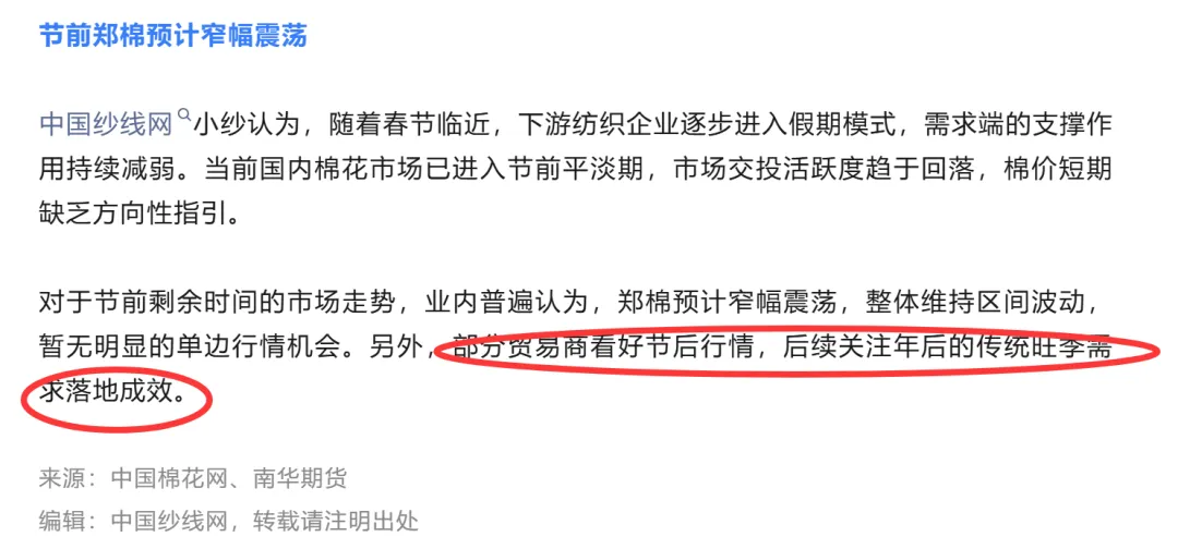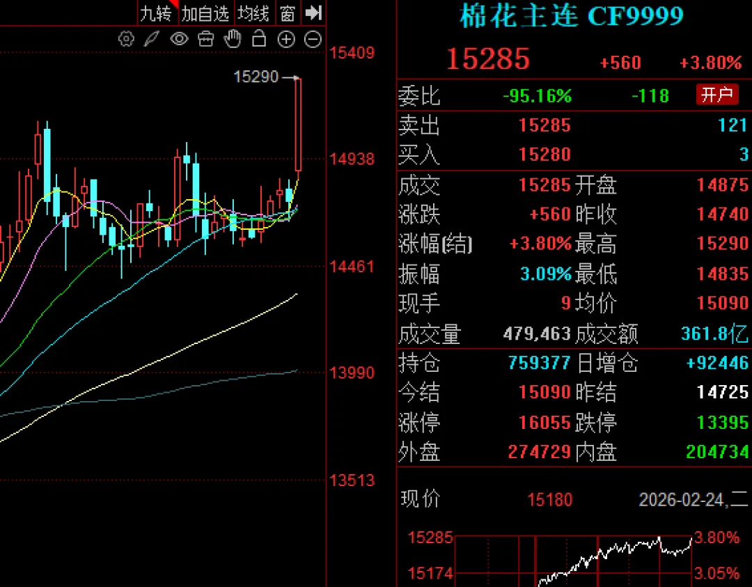 不过如果你经常看小纱的文章,应该多次看到小纱在文章中写道:“部分贸易商看好节后行情,后续关注年后的传统旺季需求落地成效。”2月24日盘中,棉花期货主力合约遭遇一波急速上涨,最高上探至15290.00元。截止收盘,棉花主力合约报15285元,涨幅3.80%。这也算没有白费小纱每天的笔墨。
