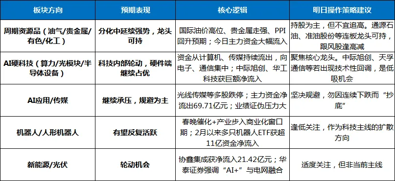 综合今日资金流向与机构观点,顺周期涨价与AI行情扩散是当前市场的两大核心主线。明日操作中应坚持: