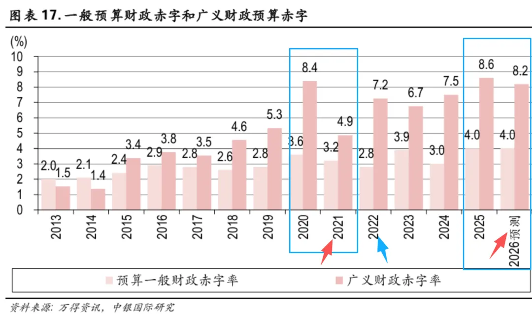 接下来的市场重点,毫无疑问将转向今年两会的财政刺激力度。根据机构预测,2026年预计新增政府债券约12.08万亿元,占GDP比重8.2%,比去年微降0.4%;赤字率设定在4%,与去年持平。