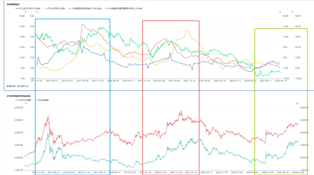 从当前数据看(下图绿色框),M1仍在回升,但社融已转头向下,10年期国债收益率也有掉头向下的趋势。好在PPI还在继续回升,这代表了企业盈利的改善。未来需要密切关注社融能否重新回升,如果迟迟不能,可能意味着本轮信用扩张周期正逐步见顶。