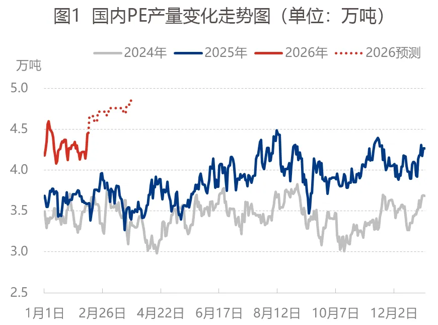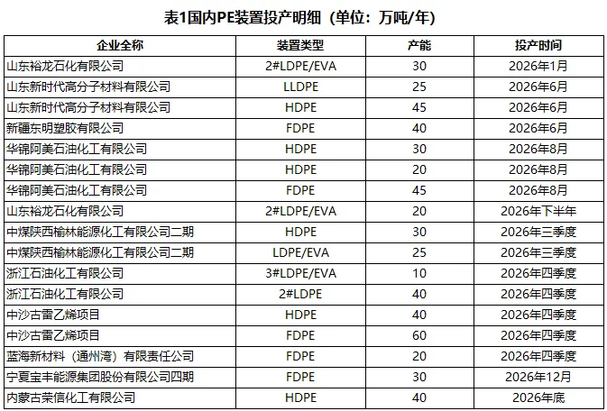 2026年国内聚乙烯预计新增产能550万吨/年,其中LDPE新增125万吨/年,HDPE新增255万吨/年,LLDPE新增170万吨/年。一季度计划投产一套30万吨/年LDPE/EVA装置,该装置以生产EVA为主,对聚乙烯整体供应影响有限。