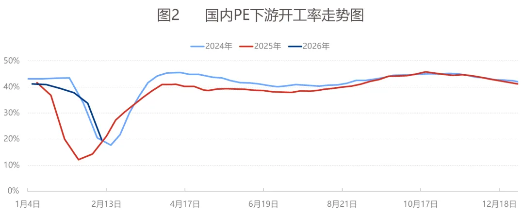 目前国内PE下游企业开工率在37.76%左右,整体呈下降趋势。仅食品、日化包装存在节前刚性备货需求,工业膜需求偏弱;北方棚膜需求基本收尾,南方订单零星,地膜虽逐步启动,但备货时机尚早,对开工提振有限。