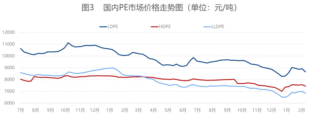 受春节假期影响,2月份国内聚乙烯产量预计296万吨,3月份随着新增产能集中释放,产量或达327万吨,创下历史单月新高。1月底下游工厂开工率为37.76%,且持续走低,节前需求持续走弱,市场交投氛围清淡,截止到2月13日开工率仅为19.8%,这一下降主要受春节下游工厂陆续放假的影响。2月份国内供应压力有所缓解,但需求恢复节奏偏缓,节后聚乙烯价格仍存在震荡下行可能;后续随着3—4月传统旺季来临及下游工厂全面复工,市场供需格局有望逐步改善,价格或止跌回稳。