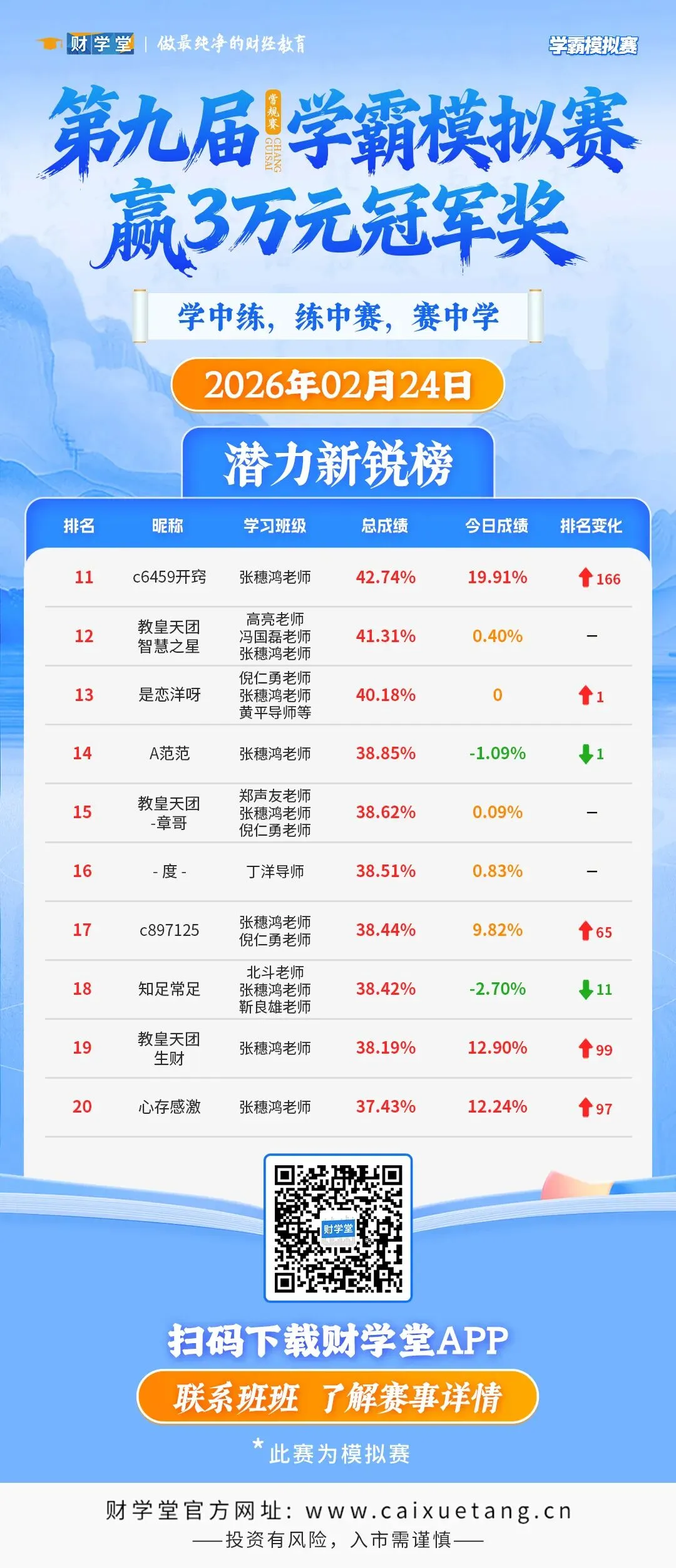 节前的积累是一部分,节后的反应速度又是一部分。第三周刚刚开启,榜单随时可能出现新的面孔。如果你还在观望,现在入场真的不算晚。打开【财学堂App】→ 首页【学习园地】→【模拟训练】立即报名参赛,别再只看热闹,直接进来,和大家一起跑完整场!