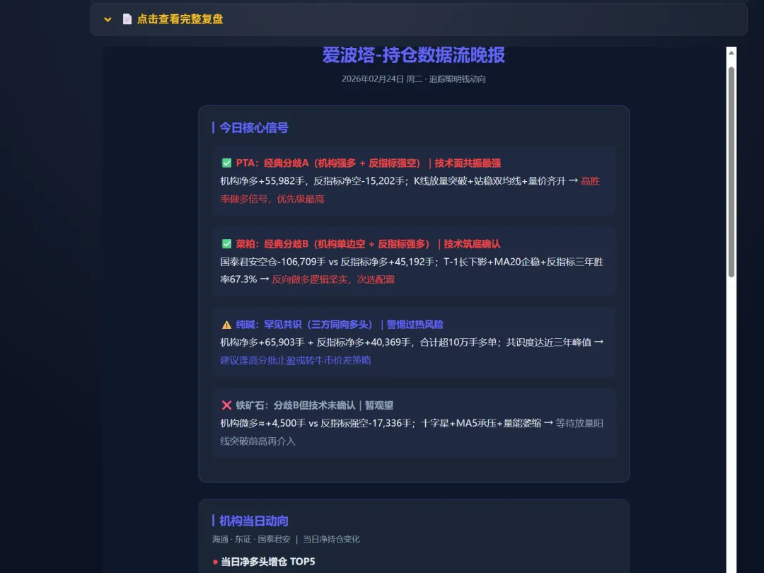 但持仓数据杂乱,一般人要去整理和分析也不容易,因此,爱波塔整合了各期货商持仓数据,并借由强大的AI结合交易艺术汇多年操盘经验,由此产生专业报告。