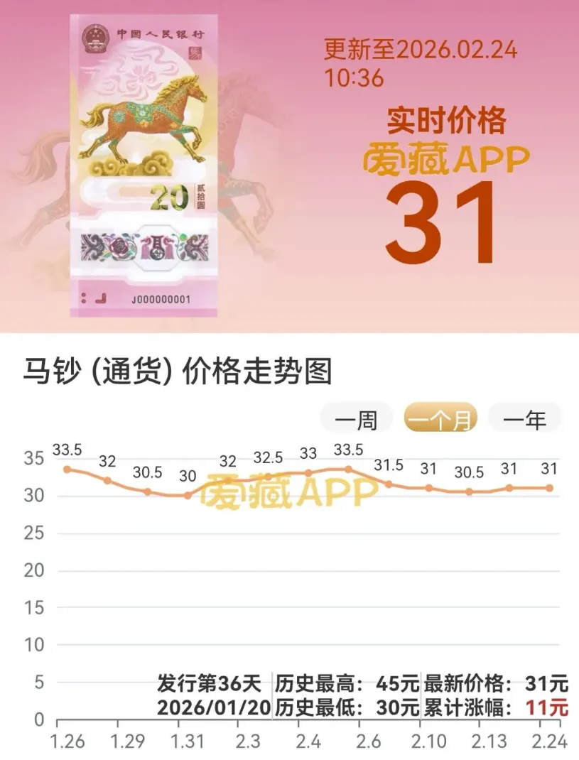 普通马钞的批量回收价格已稳定在 30元 的区间内,较前期高点下跌约25%-30%。这一走势与业内专家此前的预测基本吻合,即纪念钞新品往往遵循“高开低走”的规律。目前的价格被认为是短期投机资金撤离后,真实收藏需求形成的市场底。