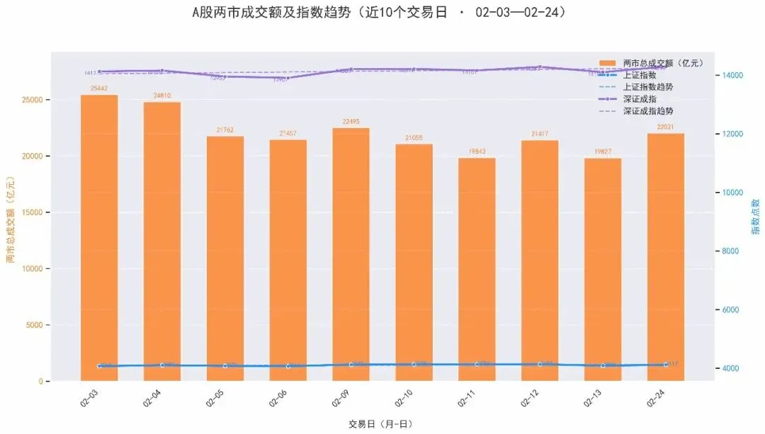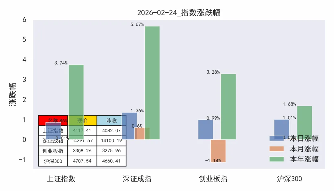 2月24日马年首个交易日,A股迎来强势开门红,三大指数全线收涨,市场情绪显著回暖。截至收盘,沪指涨0.87%报4117.41点,深成指涨1.36%,创业板指涨0.99%;两市成交额2.2万亿元,较节前明显放量,超4000只个股上涨,赚钱效应扩散。