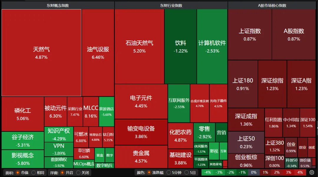 整体来看,今天A股三大指数全线收红,迎来了马年开门红。全市场超过4000只个股上涨,其中109只涨停。不过,涨势主要集中在油气、贵金属、化工、煤炭等周期板块,而大多数其他板块要么只是勉强跟上大盘,要么干脆跑输。