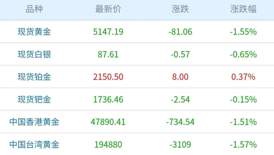 今天贵金属期货实时查询→国际伦敦金价5147.19美元/盎司,国内品牌金店周大福、周生生、周六福、老凤祥等金饰价格1565-1570元/克