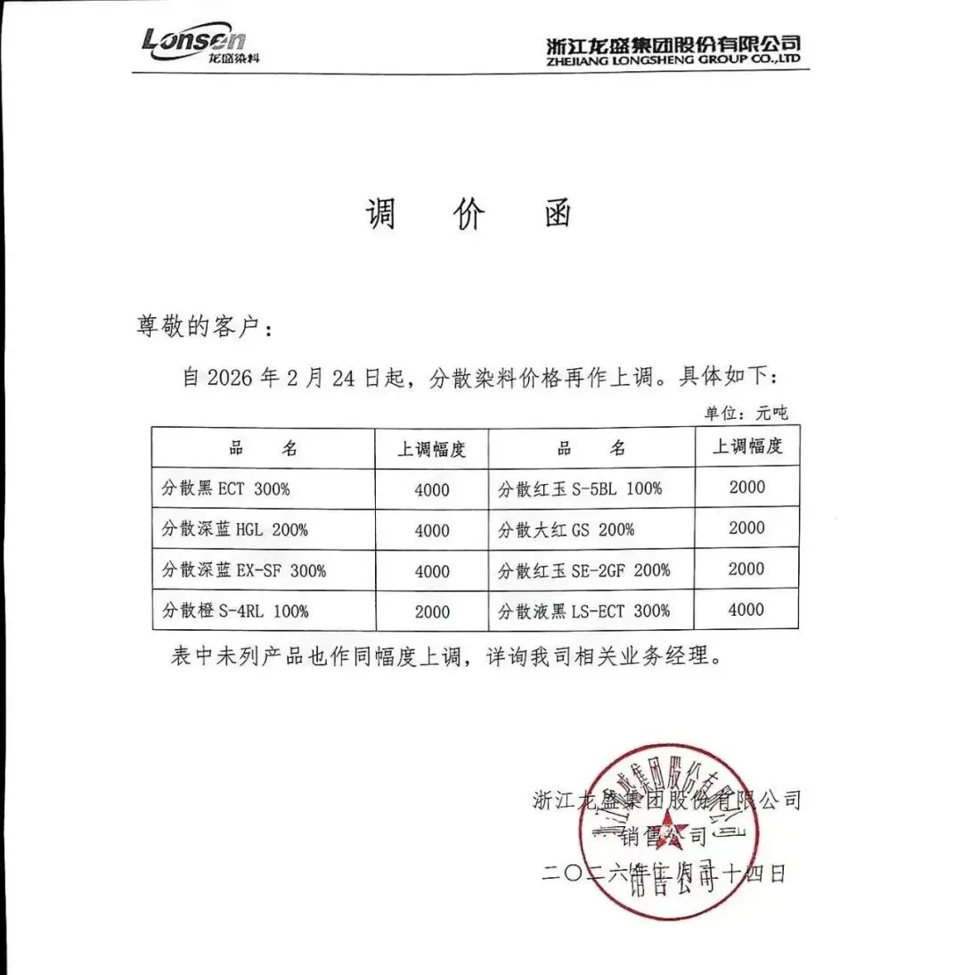 浙江龙盛于2月8日率先发布调价通知,分散黑等主力品种统一上调2000元/吨。浙江龙盛表示,此次调价直接受还原物价格上涨驱动,属于成本跟随调整。同时提到,当前活性染料主流品种涨价相对温和,但部分小品种涨幅明显,关键中间体(还原物、6‑氯等)价格上行明显,例如活性艳兰报价已由15万元/吨上调至18万元/吨。
