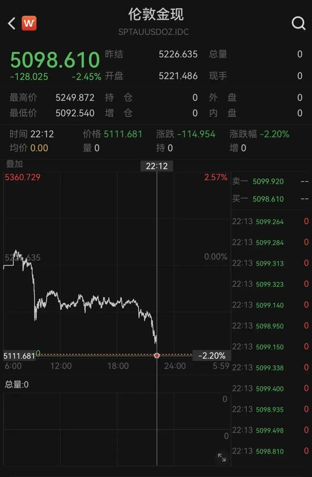 24日晚间,现货黄金持续下挫,盘中跌破5100美元大关,跌2.45%。