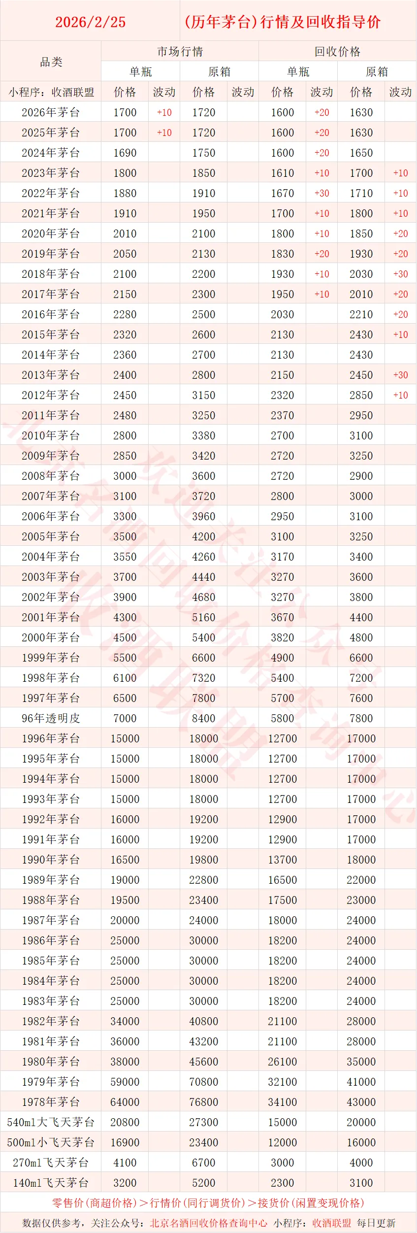 以下内容为,本公众号每日会及时更新的飞天茅台、生肖茅台、年份茅台,陈年茅台及不同毫升容量茅台的市场行情和回收报价;还包含五粮液、汾酒、剑南春、泸州老窖等国产名酒的行情及回收价,法国拉菲、木桐、玛歌等名庄红酒的回收报价,轩尼诗、马爹利、人头马等世界知名洋酒威士忌的回收参考价,每日整理不易,请点击关注支持。▪畅销类茅台行情及接货参考价▪