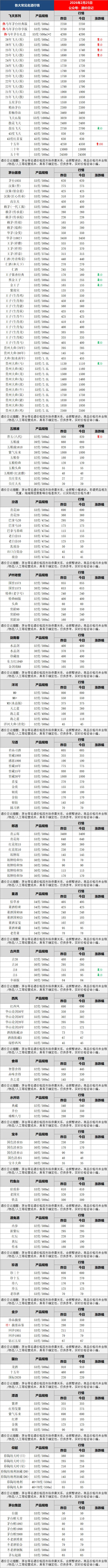茅台系列酒价格最新动态更新:飞天系列,2025-2026年飞天原箱、散瓶上涨,茅台十五年更是单瓶涨幅达百元;文创产品鼓乐飞天大幅下跌;