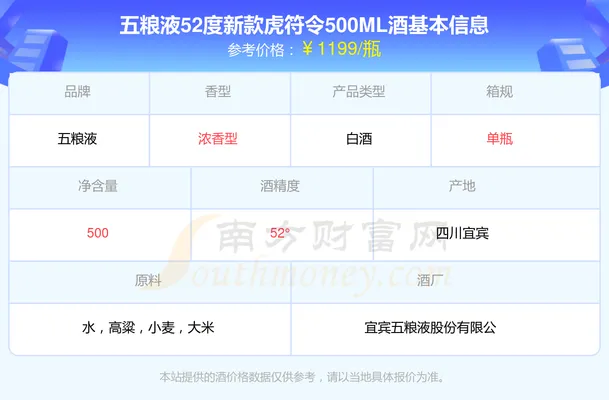 - 特点:限量文创产品,强调花果香风格,酒体磅礴复杂,收藏属性突出(2026年五粮液白酒虎符令52度浓香型500ml酒价格表一览)