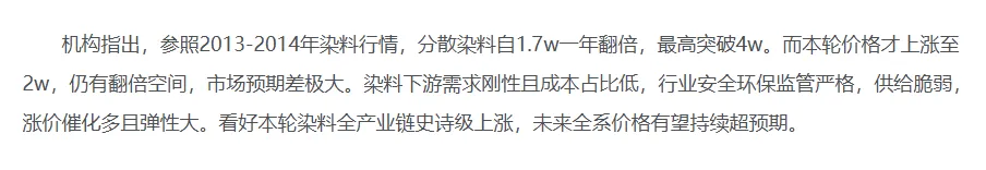 对照历史更能看清空间:2013-2014年染料大周期,价格从1.7万/吨暴涨至4.5万/吨,涨幅高达165%。当前分散染料价格仅1.8万元/吨,处于周期起步位置,若复刻历史行情,潜在涨幅超150%,翻倍仅是起步。