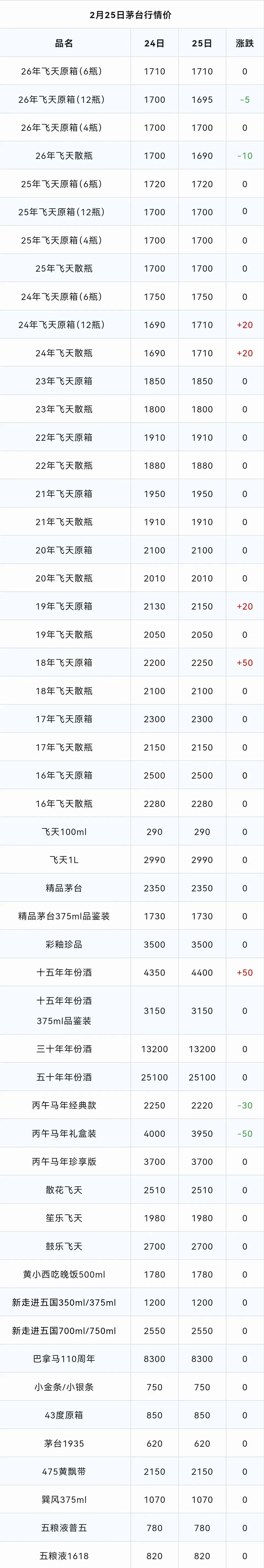 由于公众号平台修改了推送规则,如果不想错过“茅酒顾问”行情价,记得读完点一下“在看”,这样每次新文章推送才会第一时间出现在你的订阅列表里。今日(2月25日),从茅酒顾问发布的白酒价格行情监测数据显示,近段时间整箱茅台价格一直在1550徘徊,散瓶在1540左右,今日53度贵州飞天茅台(500ml)一批价跌至1710元左右!散飞在1690。