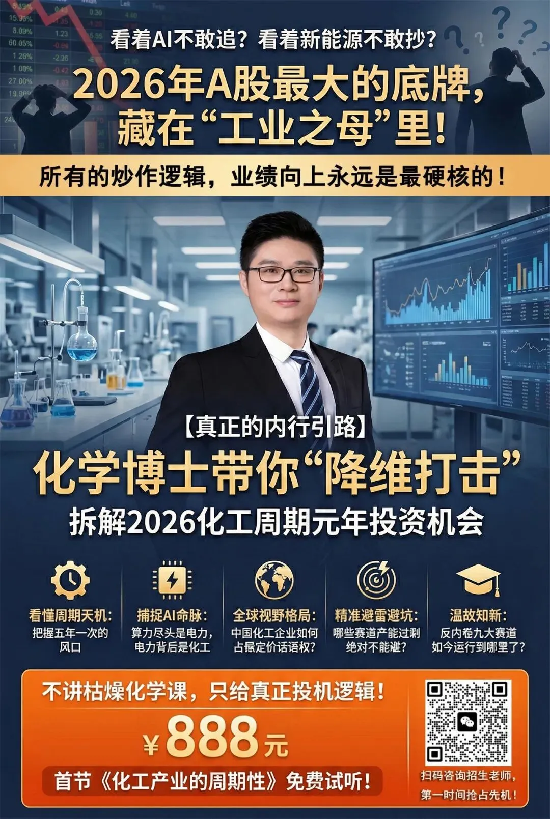 📘 想要系统掌握2026年周期行情脉络?徐可导师精心打造的 《2026年化工周期元年投资策略》 系列课程(共五集)已全面上线!从宏观研判到细分赛道,带你提前锁定全年主线。