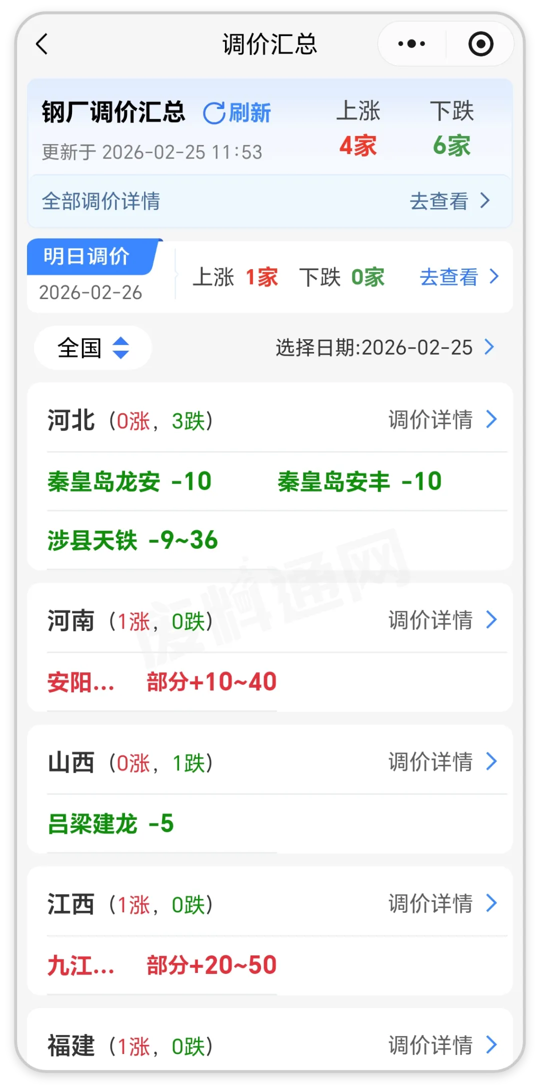 2月25日内蒙古【赤峰中唐】所有料型含税降20元。执行价:重废压块2000,彩钢瓦压块1910,铁销压块2120,镀锌压块2075。