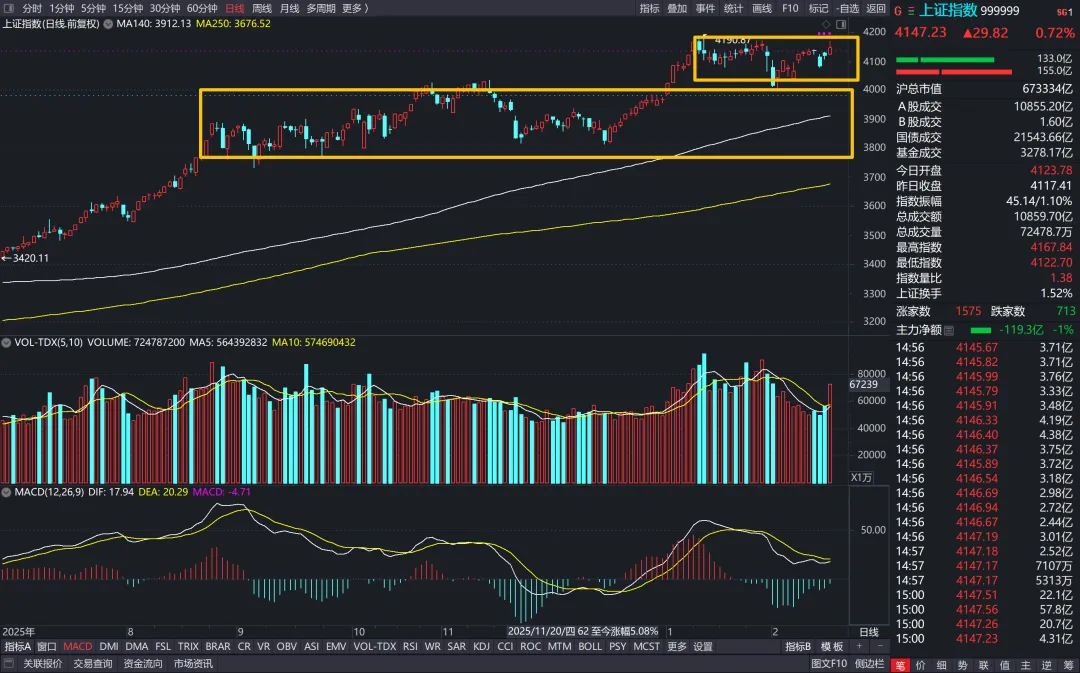 今天指数借昨天的跳空放量收阳,其实节后这两天的走势应合为一天来看。指数昨天跳空高开后就应该直接走出今天的上冲动作,整体进度反而拖慢了一些。短期来看,新高行情随时可见,只不过今天的量能释放较大,小级别需要缩量震荡整顿一下军心,稍作休整后,仍有继续上冲的动能。