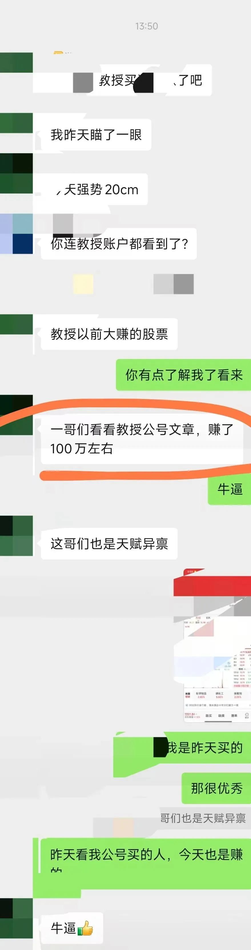 我哥群里今天有股友说,有朋友看我文章抄作业,赚了100多万。我说,今天后台也有粉丝留言,说昨天看我文章今天一早又直接抄作业了。所以今天又吃了大肉。
