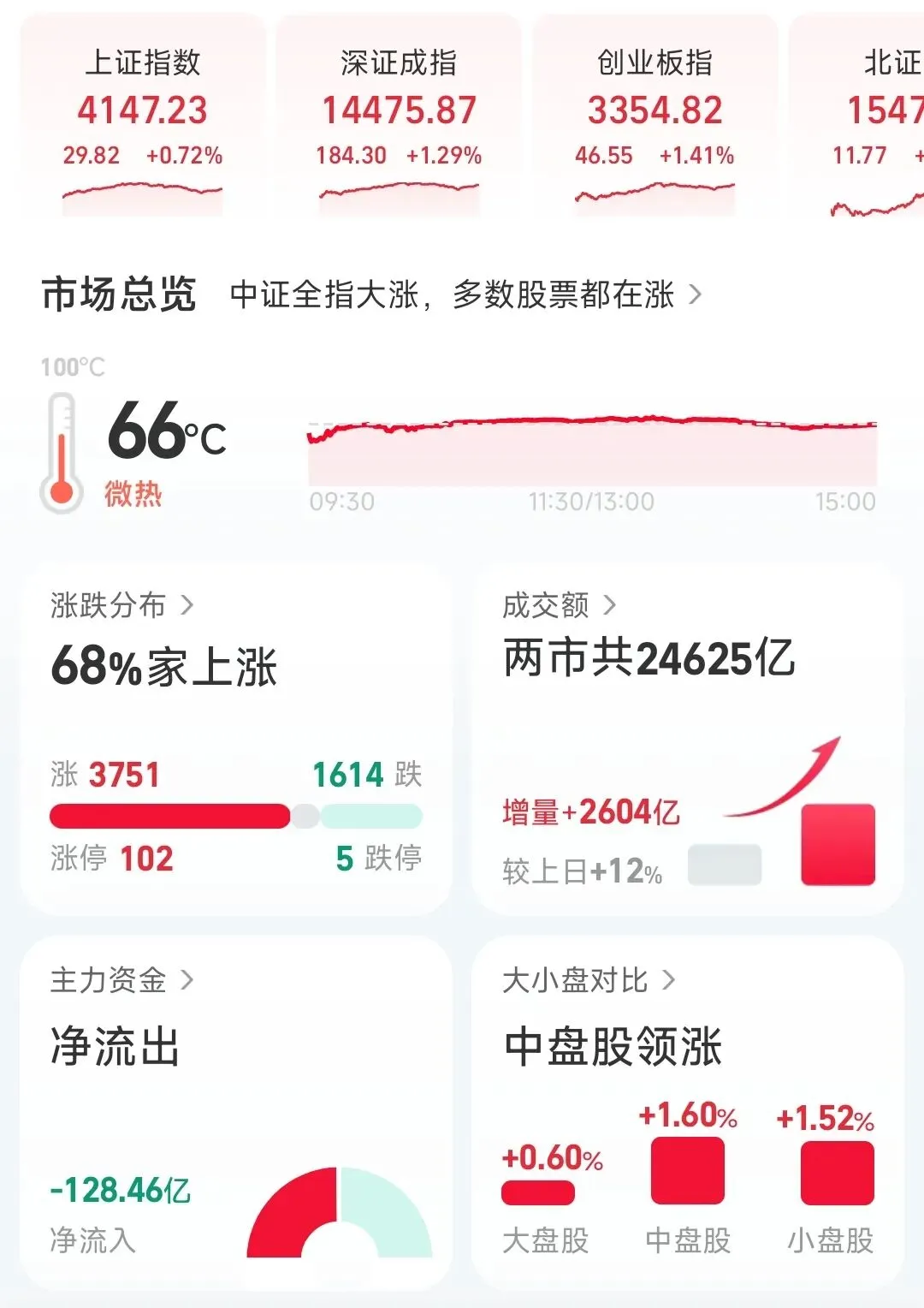 今天两市上涨的家数较昨天有所减少,不过也在三分之二以上,两市上涨的家数达到了3751家,可以说个股的赚钱效应还是不错的。今天两市的成交量继续放大,较昨日增加了12%,达到了24625亿。与昨天上涨的细微差别是,大中小盘股出现了一些些的分化,大盘股的表现要小于中小盘股。这就说明分歧已经开始慢慢地产生了。