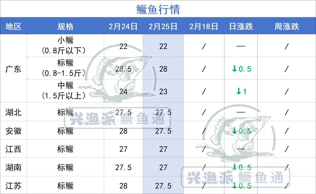 2月25日,广东标鳜跌0.5元/斤,中鳜跌1元/斤。安徽湖南江苏跌0.5元/斤。
