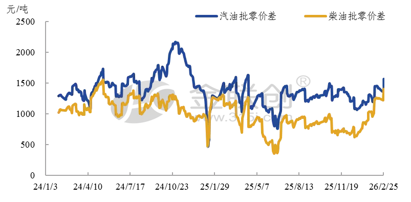 2026年以来国际市场方面在地缘风险升温、供应端收紧、需求端韧性增长三大核心因素共同作用之下,原油价格走势呈现“整体上行、小幅回调”的运行特征,布伦特站稳70美元/桶附近,WTI原在66美元/桶附近波动,春节假期期间累计涨幅近6%。受此影响,国内成品油零售价调整节后首日迎来上调,但节后原油收盘连续两日下跌,消息面支撑不足,批发端行情趋弱运行为主,国内批零价差走势再创新高。其中汽油批零价差触及2025年4月以来的高位,柴油批零价差触及2024年5月以来的高位。