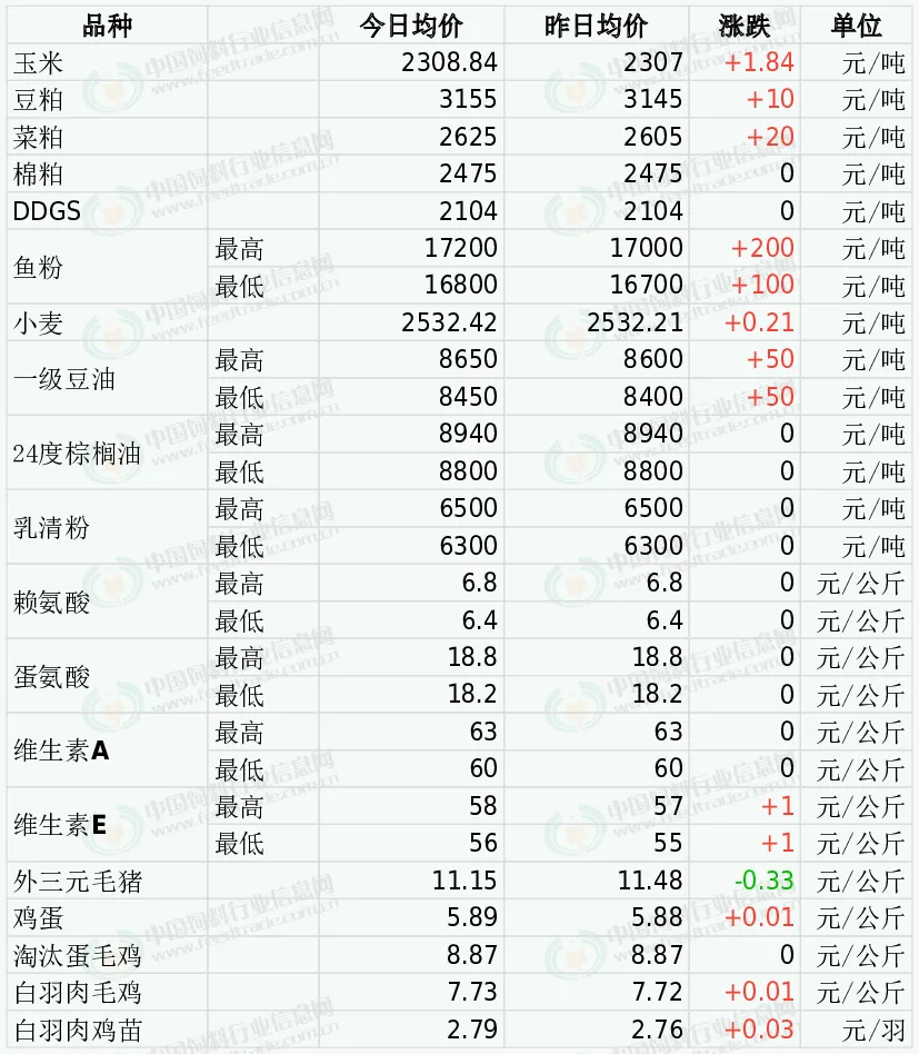 25日DDGS价格平稳。春节后市场需求较为平淡,走货表现一般,部分酒精企业执行合同,物流运输有所恢复,企业发货为主,玉米价格偏强,成本面对DDGS价格仍有一定支撑。综合多方因素影响,我们预判2月份上半月期间大多数时候DDGS交易价格总体稳定走势为主下半月略显偏弱走势为主的可能性更大,月度均价环比继续下跌的几率依旧更高。因市场对美国关税政策动荡可能影响对中国潜在销售的担忧暂时缓解,叠加国内大豆需求强劲支撑,CBOT大豆期货收盘上涨,基准期约收高0.4%,徘徊在三个月高位附近。春节期间巴西大豆收割进度落后暂缓供应压力,但美国关税和贸易政策的不确定性削弱美豆反弹的持续性。节后油厂陆续复工生产,饲企和贸易商以消化节前库存为主,入市采购积极性不高,豆粕库存有望逐步攀升。加之国内豆粕供需稳定,远期供应预期充足,限制豆粕价格跟随进口大豆成本跟随美豆上行支撑带来的涨幅。今日棉粕市场价格稳定为主。节后油厂陆续复工生产,饲企和贸易商以消化节前库存为主,入市采购积极性不高,豆粕库存有望逐步攀升,豆粕上行有压力,利空棉粕。而棉粕产出恢复慢,供应端压力不大。需求端,对棉粕需求保持平稳,无明显增量。预计棉粕价格震荡调整。今日郑州菜粕期货低开后震荡上涨。加拿大油菜籽期货连续第五个交易日上涨,基准期约收高0.4%,主要原因是芝加哥豆油期货走强带来有力提振。菜粕现货小幅上涨,中加贸易局势牵制菜籽商业买船,供应压力不大,且仍处于需求淡季,菜粕预计震荡为主。外盘方面价格坚挺,其中秘鲁新季超级蒸汽鱼粉预售参考价格为CNF2300美元/吨。国内进口鱼粉市场,持货商挺价观望,当前秘鲁超级蒸汽鱼粉价格集中在16800-17200元,上涨了100-200元。同时国产鱼粉价格有所上涨,山东荣成地区63%蛋白TVN150的国产鱼粉参考报价在13600元/吨,上涨300元/吨。今日小麦市场价格平稳为主,稳中个别有涨。企业仍较少变动,整体暂时仍以稳定为主。昨日CBOT豆油市场再刷新高,美国生柴政策引发的豆油需求炒作仍在持续。昨日马来西亚棕榈油市场连续第三日收低,受到出口需求疲软和马币走强的拖累。当前豆油供应整体宽松但,油厂目前逐步恢复开机,但整体开机率仍未回升至高位,供应释放节奏平缓。豆油库存处于历史同期偏高水平,但近期呈现小幅去库态势,支撑现货价格小幅上行。目前仍处于春节后消费淡季,下游企业采购以按需补库为主,市场成交表现平淡,随着国内企业逐步复工、学校陆续开学,餐饮及团餐用油需求有望逐步回暖,预计近期整体延续震荡偏强态势。中美贸易冲突缓和,互相取消额外的商船岗务费,国内港口乳清粉到货量趋于好转,大猪仔猪价格低迷,乳清粉市场报价稳中偏弱整理,后续需注意关税谈判进展以及港口库存量等因素。2025年12月,我国赖氨酸与赖氨酸盐及酯的出口量为9.8万吨,同比增0.4%,环比增8.4%。11月万里润达氨基酸生产线计划阶段性升级检修。1月28日星湖伊品98.5%赖氨酸上调150元/吨,70%赖氨酸上调200元/吨 。2月2日市场称金玉锋98.5%赖氨酸报价6.5元/公斤,70%赖氨酸报价4.5元/公斤 。市场小幅上行。2025年12月国内蛋氨酸进口量为2.1万吨,同比增10.6%,环比增66%.市场称希杰马来西亚蛋氨酸工厂12月至2026年1月初检修,新和成固蛋工厂部分生产线计划1月中下旬开始停产检修2-3周。12月31日市场称新和成固蛋提价至18.5元/公斤。1月8日市场称宁夏紫光蛋氨酸价格上调7%。1月30日市场称安迪苏液蛋提价10%。2月3日起新和成固蛋出口报价提升8%。欧洲VA1000市场报价15-16欧元/公斤。10月28日市场称部分厂家报价提至70-72元/公斤。2026年1月6日新和成VA提价至70元/公斤。2026年1月15日市场称浙江医药VA提价至75元/公斤。欧洲VE市场报价5.5-5.8欧元/公斤。1月13日市场称浙江医药VE产品提价至72元/公斤。1月22日市场称浙江医药昌海生物分公司计划自2月初起停产约4周。2月5日市场称新和成VE产品出口报价上调15%。市场稳中偏强运行。全国均价为 11.15元/公斤,较昨日价格下跌2.87%。适重猪源充足,规模场与散户集中出栏,二次育肥热度降温,无补栏托价。春节后进入消费淡季,屠企开工但持续压价收购。市场看空情绪浓厚,无明显利好支撑,短期难反弹,预计价格仍偏弱运行。今日鸡蛋价格整体稳定。蛋鸡存栏量整体稳定,鸡蛋供应充足,目前仍处于春节后消费淡季,节前囤货尚未完全消化,市场走货整体一般,但开学季临近,学校食堂、企业团餐用蛋需求成为短期需求支撑,缓解价格下行压力。预计近期鸡蛋价格整体延续低位震荡。今日主产区山东鸡蛋均价5.71元/公斤,与昨日价格持平;河北鸡蛋均价5.56元/公斤,较昨日价格上涨0.05元/公斤;广东鸡蛋均价6.47元/公斤,与昨日价格持平;北京鸡蛋均价5.92元/公斤,与昨日价格持平。全国淘汰蛋毛鸡均价整体稳定。屠企未完全复工、终端需求平淡,供需矛盾缓和。节后鸡蛋消费进入淡季,预计近期淘汰蛋毛鸡价格偏弱震荡。今日山东地区淘汰蛋毛鸡均价9.34元/公斤,与昨日价格持平;江苏地区淘汰蛋毛鸡均价9.98元/公斤,与昨日价格持平;辽宁地区淘汰蛋毛鸡均价8.80元/公斤,与昨日价格持平。白羽肉毛鸡价格整体稳定。屠企复工收鸡导致毛鸡、鸡源阶段性偏紧,种禽端拉涨推动苗价上行,但节后终端消费疲软、屠企库存偏高,限制了整体涨幅。预计短期价格震荡偏强。今日主产区山东白