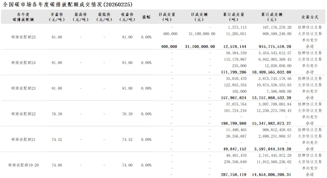 2026年1月1日至2月25日,全国碳市场碳排放配额成交量13,883,905吨,成交额1,019,624,251.80元。