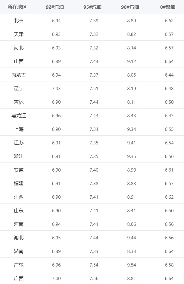今日汽油油价通知: