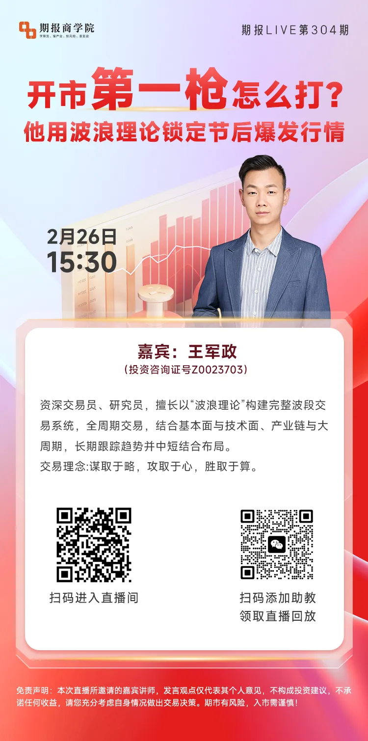 2月26日(周四)15:30,我会在期报LIVE第304期直播分享,主题就是:开市第一枪怎么打?我用波浪理论锁定节后爆发行情。