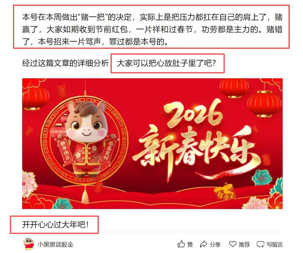 这种吃力不讨好的事,全网估计也没几个财经博主会去做。赌输了之后本号还继续发文安抚大家,让大家安心过大年,开开心心过春节,等着节后开门红。