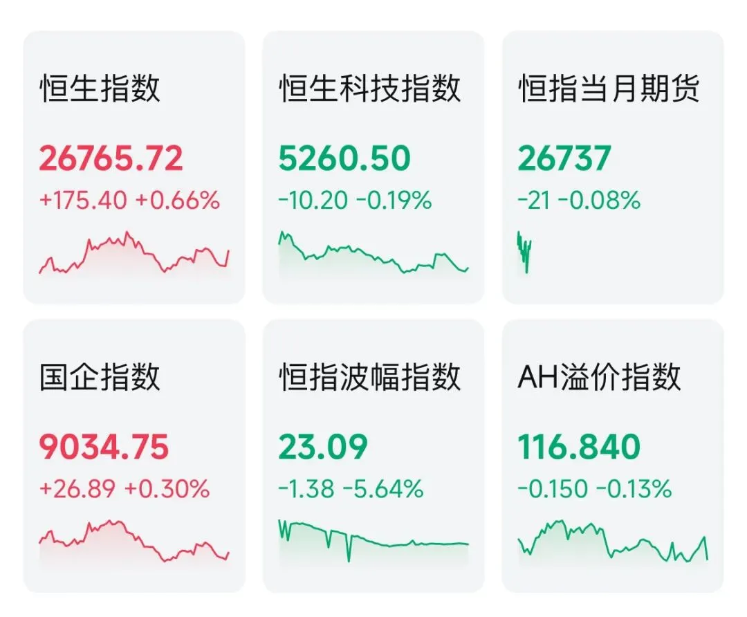 港股低开高走、指数分化,恒指收涨、科指微跌,顺周期领涨、科技偏弱,AH联动修复
